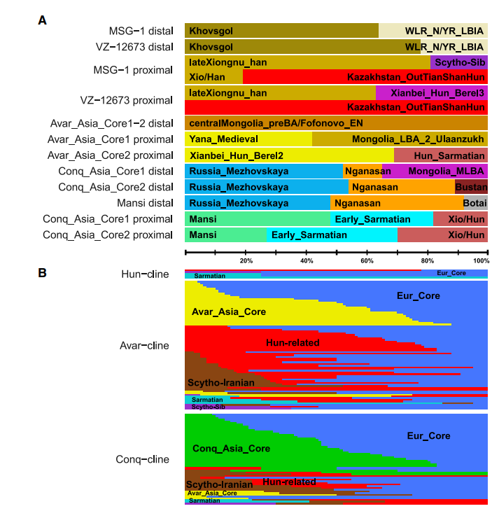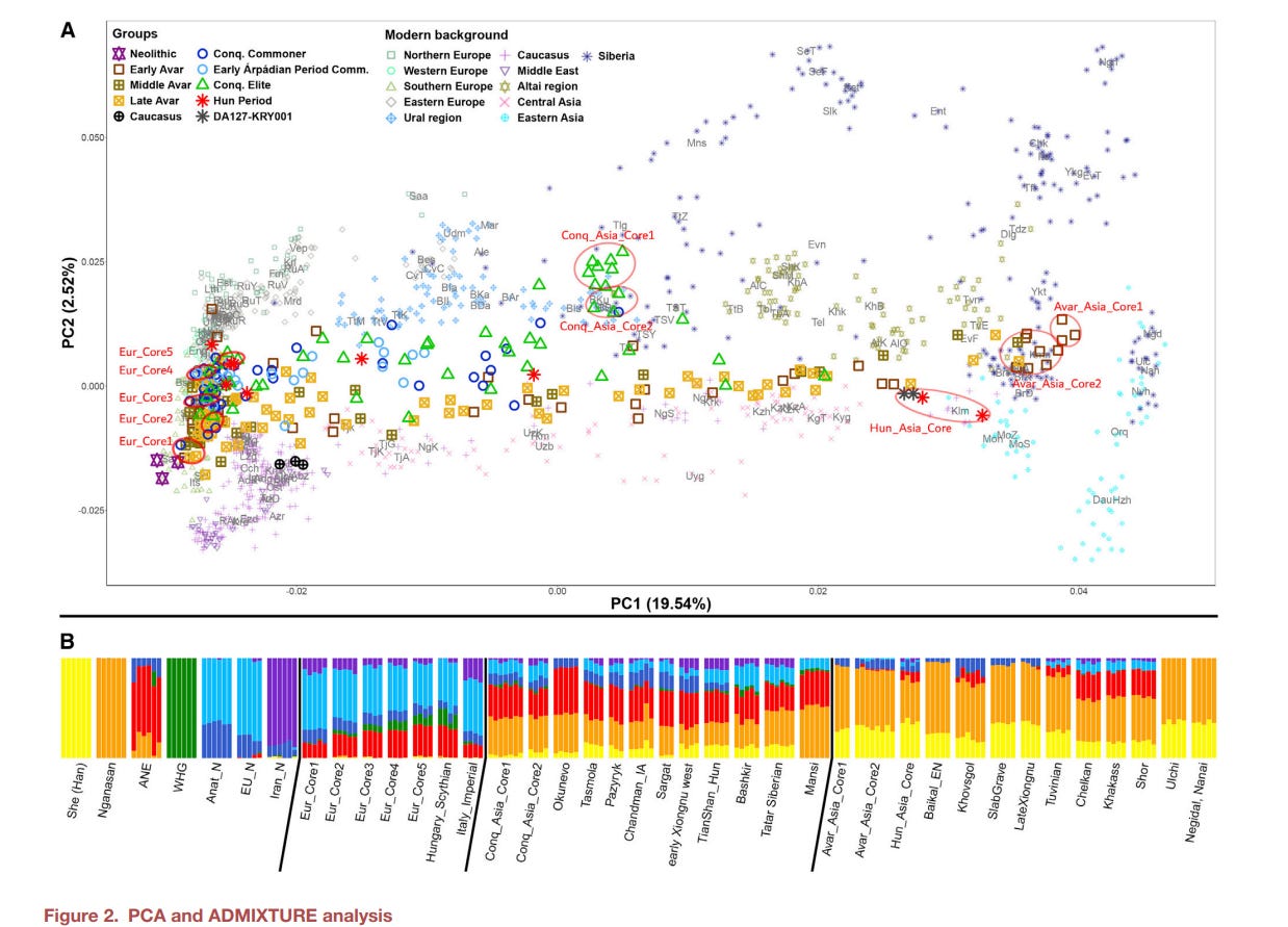 Гунны, авары и ранние венгры представляли собой кочевые племенные конфедерации, которые тремя последовательными волнами прибыли в Карпатский бассейн между V и IX веками. На основании исторических данных считается, что каждая из этих групп прибыла из Азии, хотя их точное происхождение и отношение к другим древним и современным популяциям обсуждаются. Недавно были проанализированы сотни древних геномов из Центральной Азии, Монголии и Китая, на основе которых мы стремились идентифицировать предполагаемые исходные популяции вышеупомянутых групп. В этом исследовании мы секвенировали 9 гуннских, 143 аварских и 113 венгерских образцов периода завоевания и определили три основные популяции, представляющие иммигрантов каждого периода, не имеющих недавнего европейского происхождения. Наши результаты показывают, что это «иммигрантское ядро» как гуннов, так и аваров, вероятно, зародилось в современной Монголии, и их происхождение можно проследить до хунну (азиатских гуннов), как предполагают некоторые историки. С другой стороны, «кочевое ядро» ранних венгров образовалось из более ранней смеси манси, ранних сарматов и потомков поздних хунну. Мы также показали, что общий «протоугорский» генофонд возник в эпоху бронзы из смеси людей Межовской культуры и нганасанских народов, что подтверждает генетические и лингвистические данные. Кроме того, мы обнаружили общее происхождение, связанное с гуннами, у многочисленных генетических отклонений периода аварского и венгерского завоевания, что указывает на генетическую связь между этими последовательными группами кочевых народов. Помимо основных групп иммигрантов, мы определили, что большинство людей каждого периода были местными жителями, имеющими «коренное европейское» происхождение.