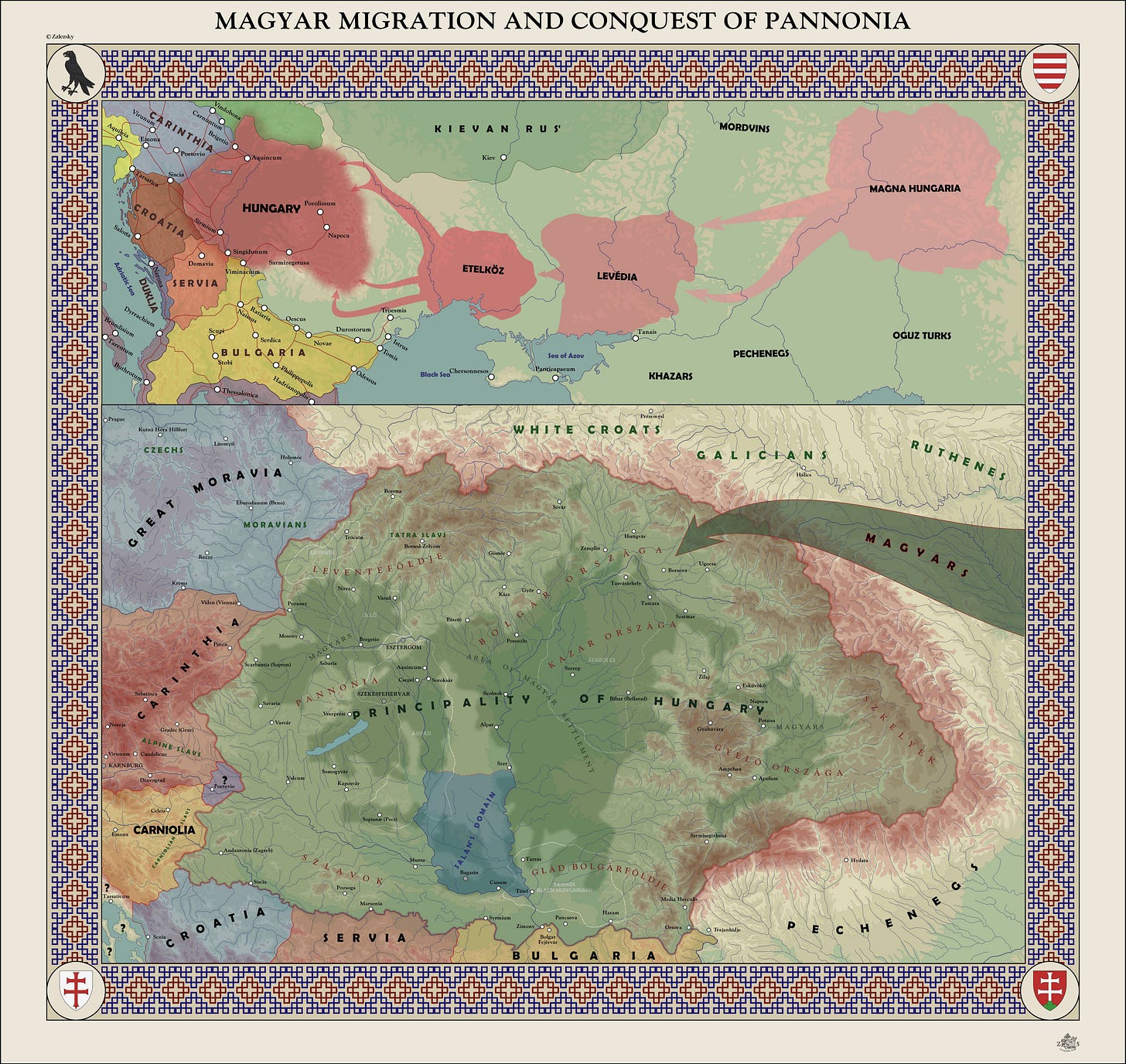 И гунны, и авары основали многонациональную империю в Восточной Европе с центром в Карпатском бассейне. Появлению гуннов в европейских письменных источниках около 370 г. н. э. предшествовало исчезновение хунну из китайских источников. Аналогично, появление аваров в Европе в шестом веке во многом коррелирует с распадом Жужаньской империи. Однако возможно отношения между хунну и гуннами, а также жужанами и аварами остаются во многом противоречивыми из-за нехватки источников. Начиная с XIX века, лингвисты пришли к единому мнению, что венгерский язык является членом уральской языковой семьи, принадлежащей к угорской ветви с его ближайшими родственниками — языками манси и ханты. На этой лингвистической основе венгерская предыстория была переписана, и завоеватели стали рассматриваться как потомки гипотетического прото-угорского народа. В то же время ранее принятые гунно-венгерские отношения были поставлены под сомнение источниковедением средневековых хроник.