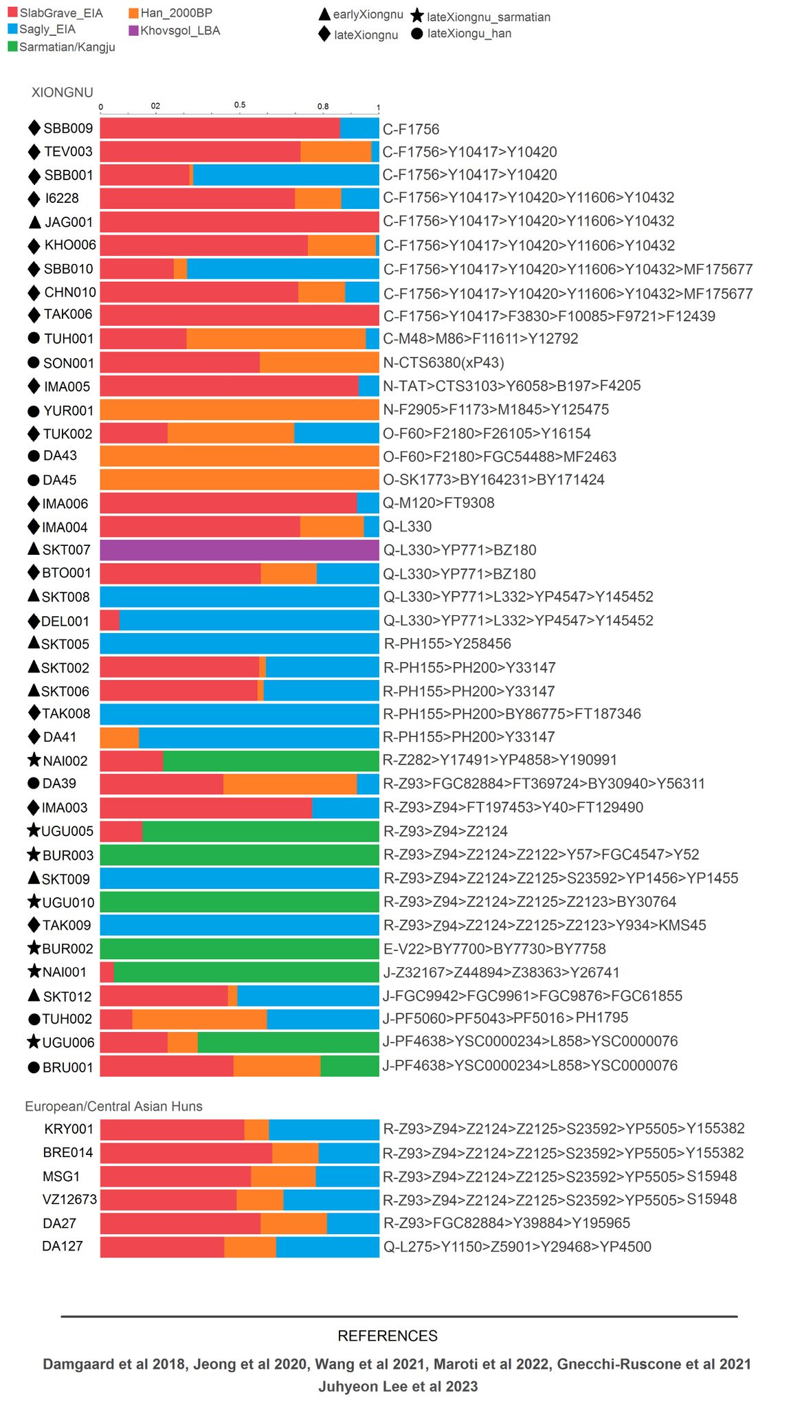 Оба человека из кластера Hun_Asia_Core (VZ-12673 и MSG-1) несут R1a-Z94, а также гунн из кластера ASZK-1. Два других опубликованных генома, объединенные в Hun_Asia_Core, Kurayly_Hun_380CE и Kazakhstan_OutTianShanHun, являются носителями гаплогруппы R1a-Z94 и Q соответственно, что позволяет предположить, что эти гаплогруппы могут быть распространены среди гуннов. Учитывая все опубликованные геномы пост-гуннской эпохи (кочевник гуннского периода, гунно-сарматский, тянь-шаньский гунн, и сяньби-хунну), мы насчитали 10/23 R1a-Z93 и 9/23 Q, что подтверждает приведенное выше наблюдение. Эти Y-гаплогруппы, скорее всего, были унаследованы от хунну, поскольку эти гаплогруппы были часты среди них, но были редки в Европе до периода гуннов. Остальные наши образцы гунского периода с европейскими геномами содержали производные R1a1a1b1, типичной для Северо-Западной Европы, что соответствует германскому происхождению.