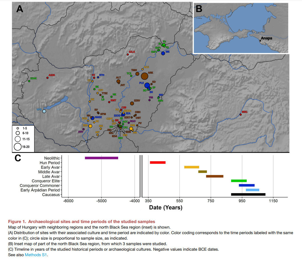 Из-за нехватки связующих литературных свидетельств и сложных археологических данных археогенетический подход лучше всего подходит для понимания происхождения и биологических взаимоотношений древних популяций. С этой целью мы провели полногеномный анализ европейских гуннов, аварцев и людей периода венгерского завоевания из Карпатского бассейна, чтобы пролить свет на давно обсуждаемое происхождение этих групп. Большинство из наших 271 древних образцов (Data S1A) были собраны на Великой Венгерской равнине (Nagyalföld), самом западном продолжении евразийской степи, которая обеспечивала благоприятную среду для прибывающих волн кочевых групп. Обзор археологических памятников и временных периодов изученных образцов представлен на рисунке, а подробное археологическое описание периодов, кладбищ и отдельных образцов приведено в Methods S1. Из изученных образцов мы сообщаем о 73 радиоуглеродных датах прямой масс-спектрометрии (AMS), из которых 50 впервые сообщаются в этой статье. В этой работе мы определили иммигрантские и местные группы из каждого периода и выявили наиболее вероятное генетическое происхождение.