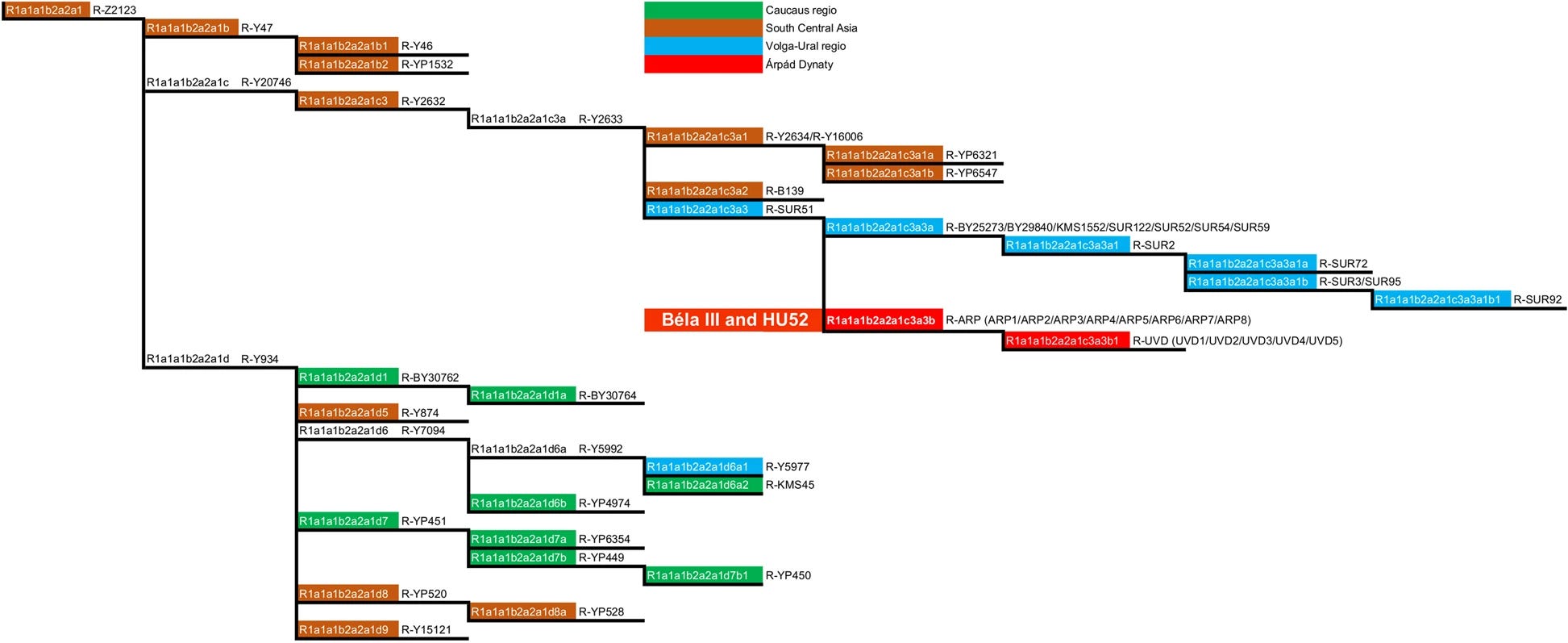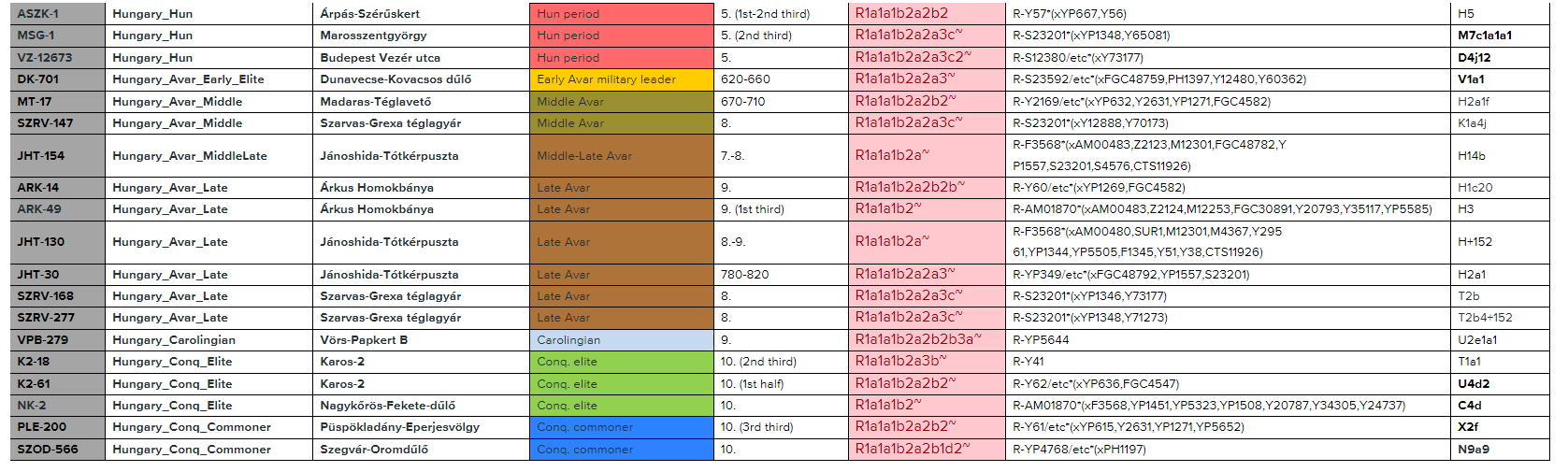 Популяция ранних венгров имела более гетерогенный состав, в сравнении с гуннами и аварами. У мужчин из Conq_Asia_Core (кластер ранних венгров) мы обнаружили три N1a1a1a1a2, один D1a1a1a1b, один C2a1a1b1b и один Q1a1a1, обычно сопровождающиеся азиатскими материнскими линиями. Два других N1a1a1a1a2a1c были обнаружены в SO-5, принадлежащих к венгерской знати. Очевидно, что эта ветвь связывает ранних венгров с манси. Другой родственный субклад N1a1a1a1a4 (M2128), был обнаружен в захоронении двух знатных венгров из настоящего исследования, а также из еще двух знатных образцов ранних венгров из наших предыдущих исследований. Эта ветвь характерна для современных якутов и встречается с более низкой частотой среди ханты, манси и казахов, таким образом, связывая ранних венгров с манси, хотя эта же ветвь есть у одного среднеаварского представителя. Примечательно, что европейский субклад I2a1a2b1a1a также был специфичен для ранних венгров, особенно для знати, опять же сопровождаясь очень часто азиатскими материнскими линиями, что указывает на то, что I2a1a2b1a1a может быть более характерен для иммигрантов, чем для местного населения. Кроме того, еще два Y-Hgs появлялся с заметной частотой среди ранних венгров: R1a-Z94 присутствовал у 3 знатных и 2 простых людей, тогда как Hg Q несли 3 знатных человека, что может быть признаком гуннского родства, также обнаруженного в геноме.