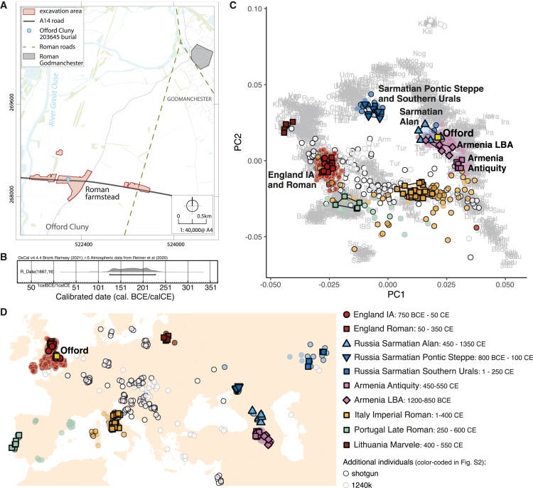 Возраст на момент смерти (18–25 лет) и история миграции (основанная как на генетическом происхождении, так и на данных о стабильных изотопах), которые мы получили от Offord Cluny 203645, могут соответствовать тому, что этот человек прибыл в Великобританию в рамках военного движения, либо как часть солдатской семьи, либо как сам солдат. Одной из возможностей, учитывая полученную радиоуглеродную дату (126–228 кал. н.э.; средний 176 кал. н.э.), может быть исторически подтвержденное развертывание сарматской кавалерии в 175 году н.э. после победы римского императора Марка Аврелия в Маркоманских войнах, как описал римский историк Кассий Дион. В этом сценарии изменения в питании, которые мы видим у Offord Cluny 203645, можно было бы объяснить, если бы он был связан с группами сарматов, переселившихся в Центральную Европу до или во время Маркоманских войн, хотя правдоподобность этой интерпретация зависит от того, могли ли дети участвовать в перемещениях сарматов по Европе. Мало что известно о том, где в Британии находились 5500 сарматов. Есть предположения о сарматском конном снаряжении из Честерса на Адриановой стене и эпиграфические свидетельства о нем из Рибчестера, Бреметеннакум Ветеранорум на северо-западе Англии и Каттерика, Катарактония на северо-востоке Англии, — все это на значительном расстоянии от стоянок А14 в Кембриджшире.