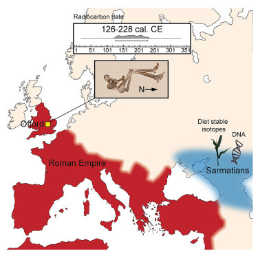 Во втором веке нашей эры Римская империя все чаще контактировала с сарматами, кочевым ираноязычным населением, занимавшим территорию, простирающуюся от Понтийско-Каспийской степи до Карпатских гор, как на Кавказе, так и на дунайских границах империи. В 175 году н. э., после их поражения в Маркоманских войнах, император Марк Аврелий набрал сарматскую конницу в римские легионы и направил в Британию 5500 сарматских солдат, как записано современным историком Кассием Дионом. Мало что известно о том, где размещалась сарматская конница, и до сих пор не идентифицировано ни одного человека, связанного с этим исторически засвидетельствованным событием, поэтому их влияние на Британию в значительной степени неизвестно. Здесь мы документируем кавказское и сарматское происхождение в геноме человека римского периода (126–228 калибр. [кал.] н. э.) — человека без прослеживаемого происхождения, связанного с местным населением в Британии, — образец был обнаружен на ферме в Кембриджшире, Великобритания. Хотя возможны несколько сценариев его жизни и происхождения, ведь историческое размещение сарматов в Британии дает скудное объяснение необычной истории жизни этого человека. Независимо от факторов, стоящих за его миграциями, эти результаты показывают, как движение на большие расстояния, которому способствовала Римская империя, повлияло на провинциальные районы за пределами городских центров.